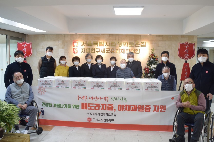 후원자·봉사자 이야기 | 구세군여성사역부 *구세군자선봉사단* 후원물품 전달식 페이지 정보 작성자 박상은 작성일 21-12-20 13:54 조회 11,368회 댓글 0건 본문 구세군 여성사역부 성탄나눔 2021.12.17.(금)평화로운집 가족들이 추운 겨울을 더 따뜻하게, 또 더 건강하게 보낼 수 있도록구세군자선봉사단에서큰 선물을 들고 찾아와 주셨습니다.춥게, 또 어둡게 느껴질 수 있는 요즘같은 시기에밝은 희망을 전달해주셔서 진심으로 감사드립니다.전달해주신 배도라지즙과 야채과일즙 드시고 평화로운집 가족 분들 모두 힘이 났습니다^-^ 이전글 다음글 목록