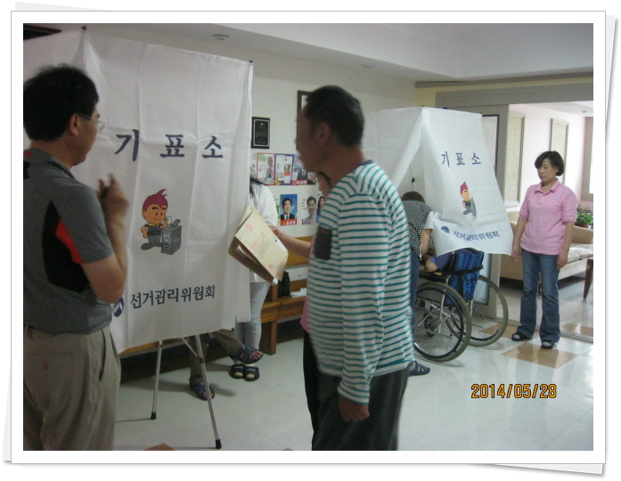 제6회 전국동시지방선거 거소투표실시 페이지 정보 작성자 이선희 작성일 14-06-02 15:59 조회 9,495회 댓글 0건 첨부파일 본문 본원 생활가족의 참정권 보장사업으로 2014년 6월4일 실시하는 제 6회 전국동시지방선거를 위한 거소투표를 진행되었고, 선거관리위원회에서 3명이 나오셔서 거소투표소에서 원활하게 투표가 진행되도록 도와주셨습니다. 자가 이동이 가능한 소수 인원은 6월4일 지역사회투표소에서 직접 투표할 예정입니다. 이전글 다음글 목록