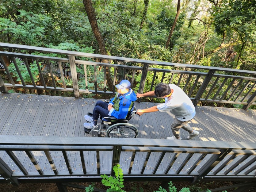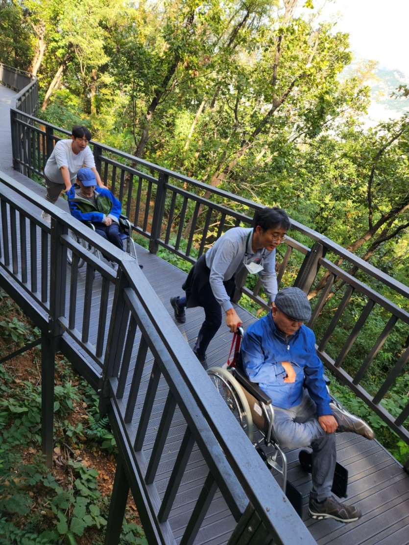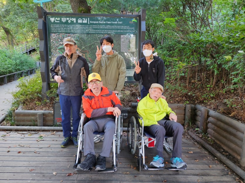거주인 이야기 | 봉산 편백나무 휠체어 숲 트레킹 페이지 정보 작성자 장설궁 작성일 23-10-09 09:18 조회 8,833회 댓글 0건 본문 평화로운집 가족들과 10월 5일 6일 봉산 편백나무길 휠체어 트레킹을 다녀왔습니다. 비 온 뒤 맑은 하늘과 숲의 향기도 맡고 꽃과 나뭇잎을 만져보며 느껴보고힘들게 정상에 올라 맛보는 과일의 꿀맛 파아란 하늘이 웃어준 즐겁고 행복한 산행이었습니다. 이전글 다음글 목록