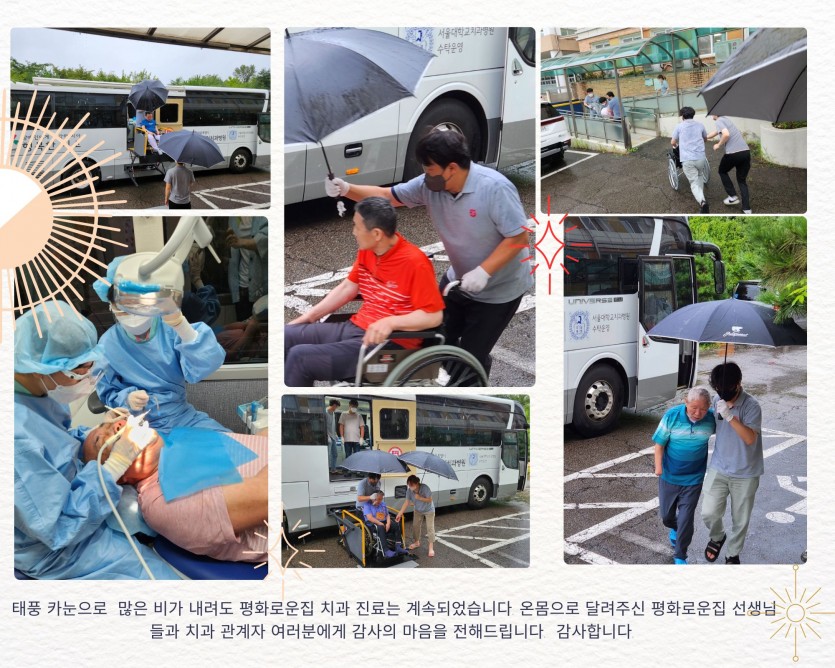 거주인 이야기 | 0810 2차 치과진료 페이지 정보 작성자 장설궁 작성일 23-08-10 17:53 조회 9,102회 댓글 1건 본문 태풍 카눈이 북상하며 많은 비가 내리는 가운데 장애인치과병원 2차 진료가 진행되었습니다. 의료진과 평화로운집 선생님들에게 다시 한번 감사의 마음을 전합니다."감사합니다" 태풍의 영향으로 강풍과 폭우가 예상된다고 합니다. 태풍으로 인한 피해 없도록 조심하세요무사히 태풍이 지나가기를 바랍니다. 댓글목록 조윤기님의 댓글 조윤기 작성일 23-08-18 19:26 비가 오는 가운데 모두 수고 많으셨습니다 비가 오는 가운데 모두 수고 많으셨습니다 이전글 다음글 목록