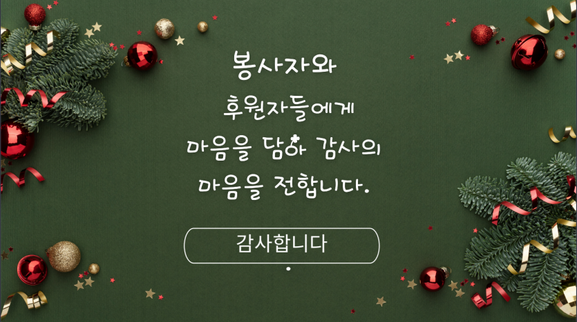후원자·봉사자 이야기 | 1207 느티나무 축제 페이지 정보 작성자 장설궁 작성일 24-12-12 13:19 조회 6,575회 댓글 0건 본문 "2024년 12월 7일거주인, 자원봉사자, 후원자들과 함께 느티나무 축제를 진행하였습니다. 참석해주신 여러분들에게 감사의 마음을 전합니다. 여러분의 따뜻한 마음과 참여로 인해 행사는 더욱 특별하고 의미 있는 시간이 되었습니다. 여러분의 지지와 도움에 진심으로 감사드립니다. 다시 한 번 참석해주신 여러분들에게 진심으로 감사의 말씀을 전하며, 앞으로도 함께 더 많은 아름다운 순간을 만들어 나가기를 기대합니다. 감사합니다." 이전글 다음글 검색 목록