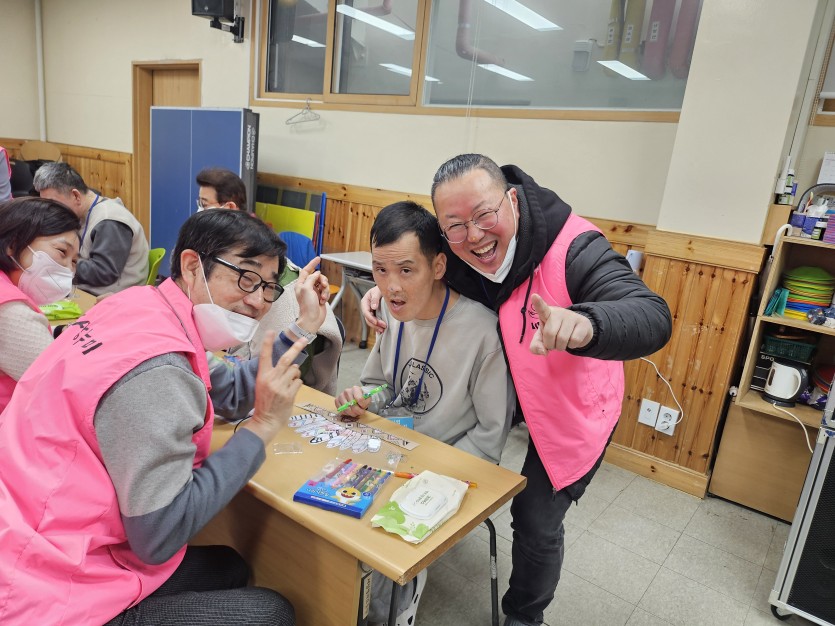 "자, 여기는 어떤 색으로 칠해볼까요?" 처음엔 낯설어하던 거주인분들도 봉사자분들의 유쾌한 농담과 따뜻한 격려에 이내 환한 웃음을 터뜨리셨습니다. 사진 속 밝은 미소처럼, 미술 활동은 단순한 체험을 넘어 서로의 마음을 확인하는 소중한 소통의 시간이 되었습니다.