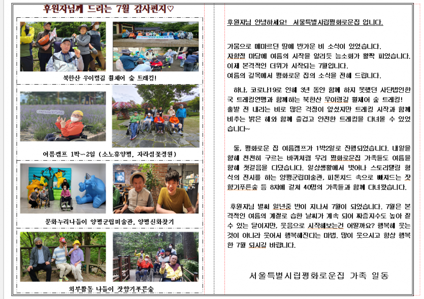 2022년 7월후원자감사편지 페이지 정보 작성자 장설궁 작성일 22-07-14 11:29 조회 12,264회 댓글 0건 본문 ༼ つ ◕_◕ ༽つ들쑥날쑥한 돌멩이가 있기 때문에 시냇물이 아름다운 소리를 내듯이 들쑥날쑥한 일상의 일들이 있을 때 인생도 아름다운 소리를 낸다고 합니다.(●'◡'●)인생이란 계속 좋은일만 있는것도, 계속 나쁜일만 있는 것도 아닙니다.혹시라도.... 지금 힘든일이 있다면.....시간이 조금 지나면 다~~~ 괜찮아 질겁니다.희망을 갖고 힘내세요~ 오늘도 화이팅!! 저희 평화로운집 가족들의 소식을 전해드립니다. 이전글 다음글 목록