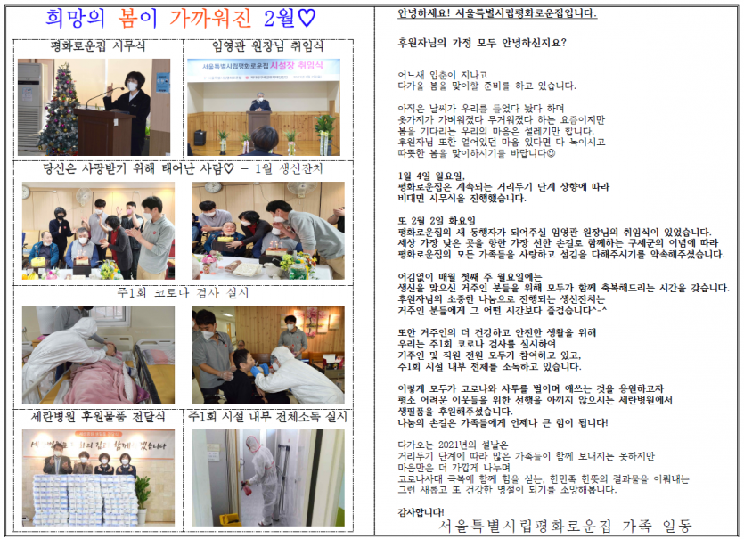 2021년 2월 후원자 감사편지 페이지 정보 작성자 박상은 작성일 21-02-06 17:02 조회 13,826회 댓글 0건 본문 2021년 2월, 어느새 봄이 다가오고 있습니다.늘 나눔으로 함께해주시는 후원자님께감사의 편지를 올립니다. 이전글 다음글 목록