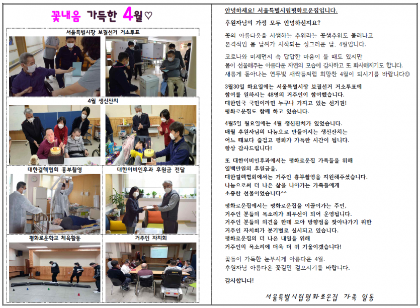 2021년 4월 후원자 감사편지 페이지 정보 작성자 박상은 작성일 21-04-07 09:40 조회 14,318회 댓글 0건 본문 2021년 4월, 활짝 핀 꽃들의 아름다움처럼 빛나는 후원자님의 나눔에 감사드립니다.늘 나눔으로 함께해주시는 후원자님께감사의 편지를 올립니다. 이전글 다음글 목록