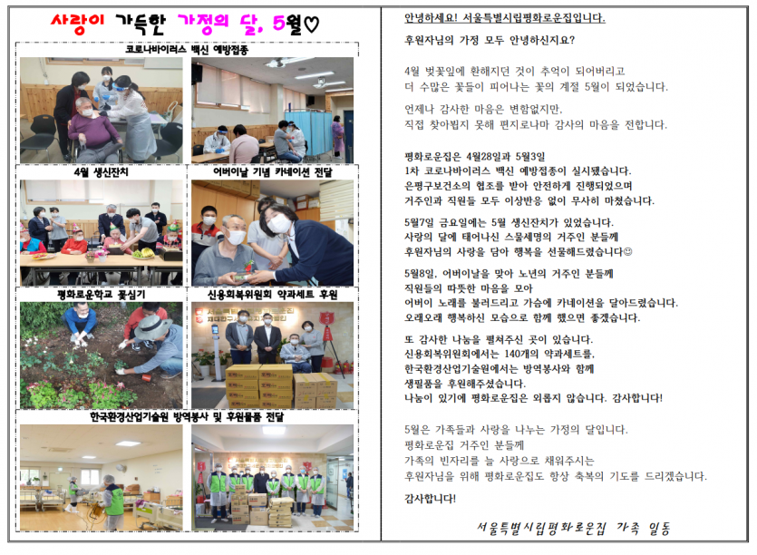 2021년 5월 후원자 감사편지 페이지 정보 작성자 박상은 작성일 21-05-17 17:55 조회 14,514회 댓글 0건 본문 5월은 꽃의 계절, 사랑의 계절..항상 사랑으로 함께 해주시는 후원자님의 나눔에 감사드립니다.늘 나눔으로 함께해주시는 후원자님께감사의 편지를 올립니다. 이전글 다음글 목록