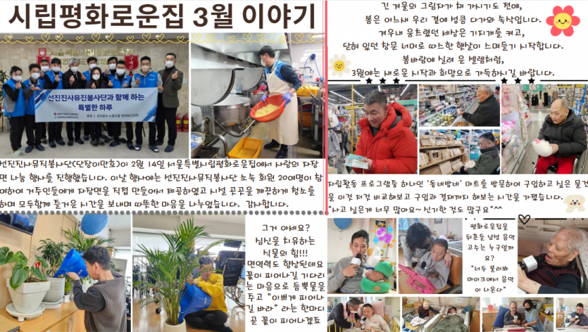 2025년 3월 시립평화로운집 후원감사편지 페이지 정보 작성자 장설궁 작성일 25-03-04 15:15 조회 4,644회 댓글 0건 본문 HELLOSPRING^^겨울의 추위를 견뎌낸 우리에게 희망과 설렘을 선물하는 3월꽃처럼 피어나는 행복을 가득 담아 보내드립니다. 이전글 다음글 목록