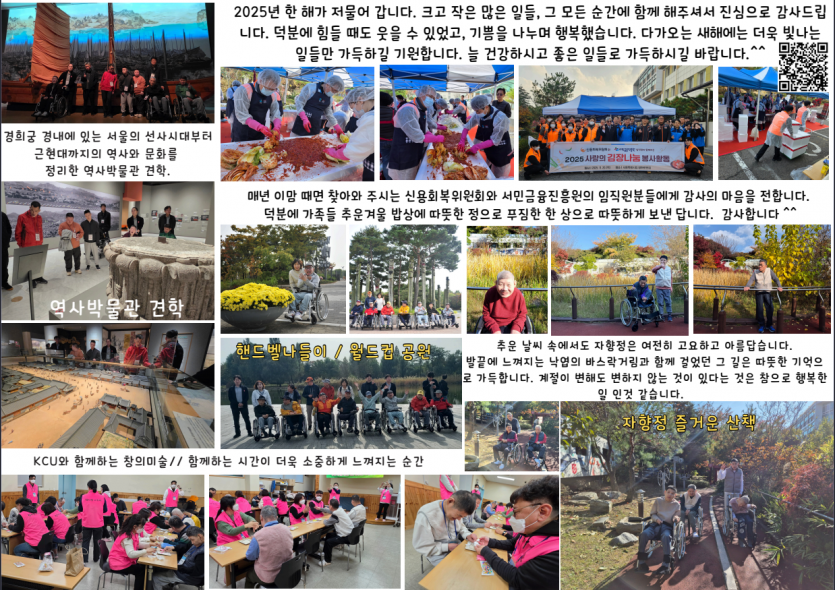 2025년 시립평화로운집 12월 후원감사편지 페이지 정보 작성자 장설궁 작성일 26-01-04 09:46 조회 894회 댓글 0건 본문 어느덧 마지막 달이 되었네요올해 저히에게 찾아온 소중한 인연에 깊이 감사드립니다.남은 한 달도 행복한 추억 많이 만드시길 바라며,다가오는 2026년에는 더욱 멋진 일들로 가득하시길 응원하겠습니다. 이전글 다음글 목록