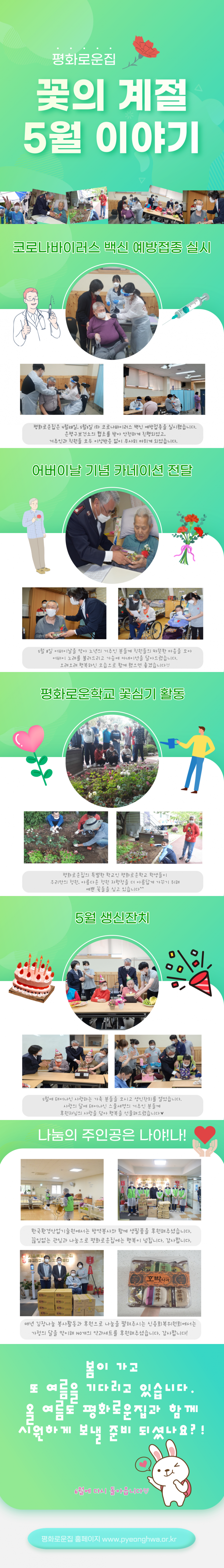서울특별시립평화로운집 5월 카드 뉴스! 페이지 정보 작성자 박성호 작성일 21-05-25 11:25 조회 17,219회 댓글 0건 본문 가정의달 5월!2021년 서울특별시립평화로운집의 5월엔 어떤일이 있었을까요?간편하게 볼 수 있도록 카드뉴스를 제작 했습니다! 카드뉴스를 통해 시립평화로운집의 5월을 확인해 보세요~! 이전글 다음글 목록