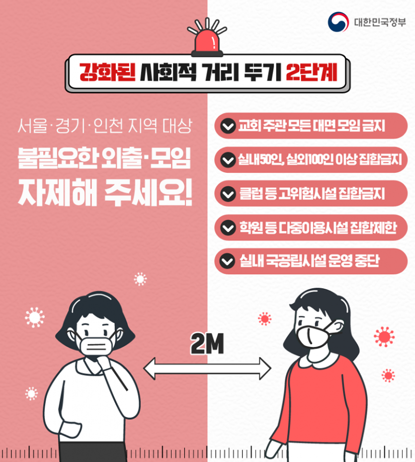 사회적 거리두기 2단계 격상에 따른 봉사활동 중단 안내 페이지 정보 작성자 박성호 작성일 20-08-20 13:50 조회 18,065회 댓글 0건 본문 최근 수도권을 중심으로 퍼진 코로나19 바이러스로 인해 사회적 거리두기가 2단계로 강화되었습니다.평화로운집은 시군구의 권고사항에 의해 2020년 3월부터 현재까지 모든 봉사활동을 중단하였습니다. 항상 평화로운집을 아껴주시고 사랑해 주시는 모든 봉사자님께 감사드립니다.사회적 거리두기와 단계별 국민 행동수칙, 개인별 방역까지 꼭! 지켜 주시기를 바라며다시 만나는 날까지 건강하시도록 항상 기도하겠습니다.감사합니다. 이전글 다음글 목록