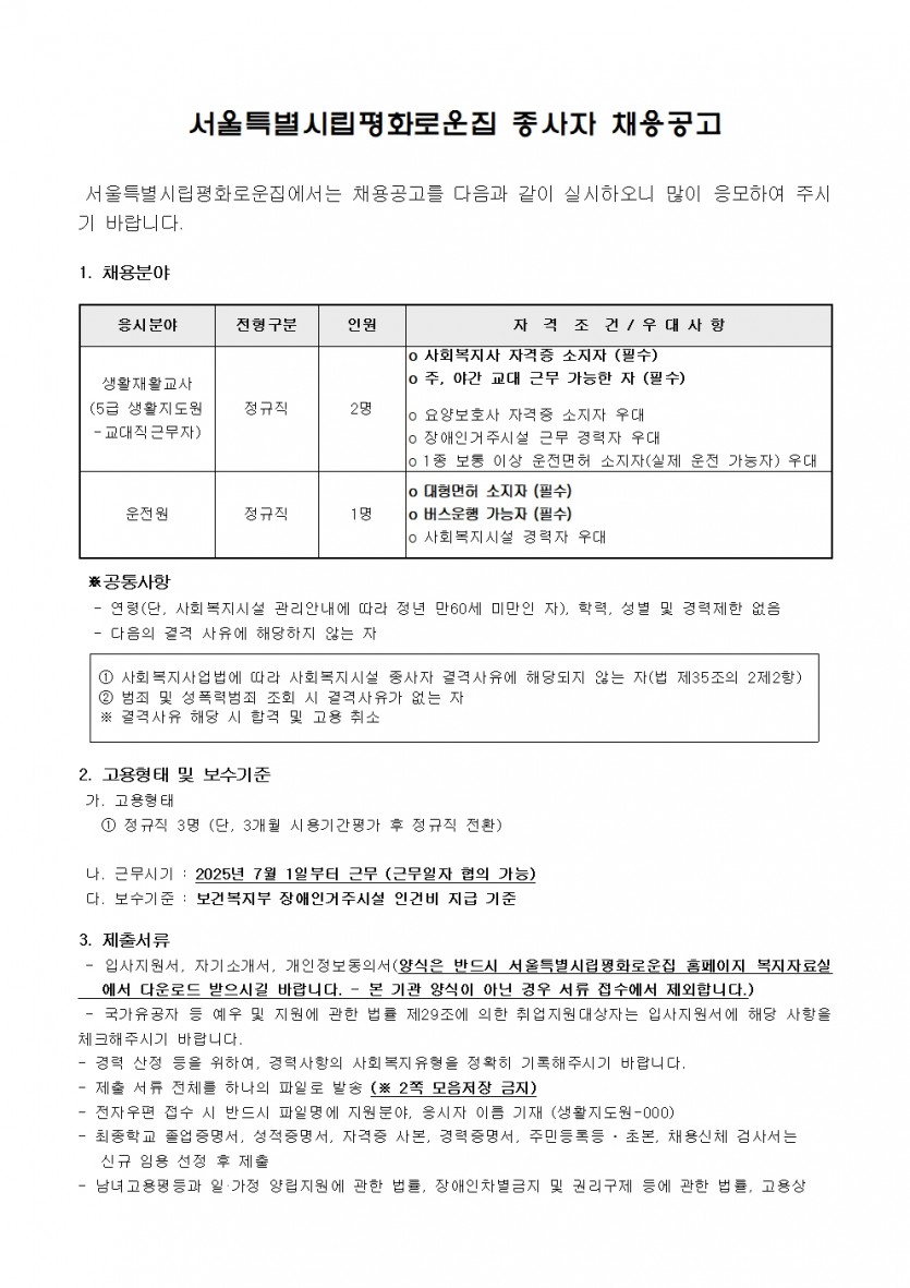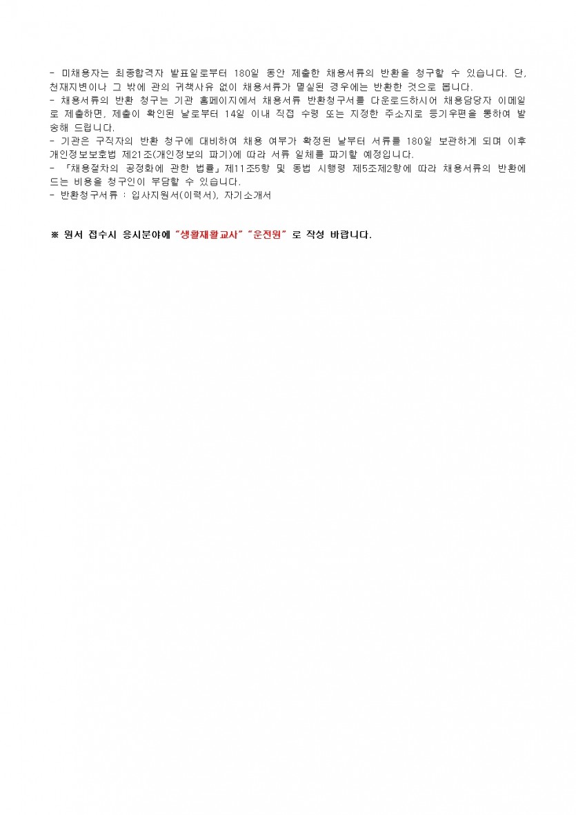 제4차 직원채용 공고(생활지도원, 운전원) 페이지 정보 작성자 한동주 작성일 25-06-04 13:54 조회 10,132회 댓글 0건 첨부파일 파일 시립평화로운집 입사지원서이력서,자기소개서및개인정보동의서.hwp (54.0K) 159회 다운로드 DATE : 2025-06-04 13:54:21 파일 2025년 4차 운전원, 생활지도원.hwp (117.5K) 131회 다운로드 DATE : 2025-06-04 16:44:36 본문 이전글 다음글 목록 답변
