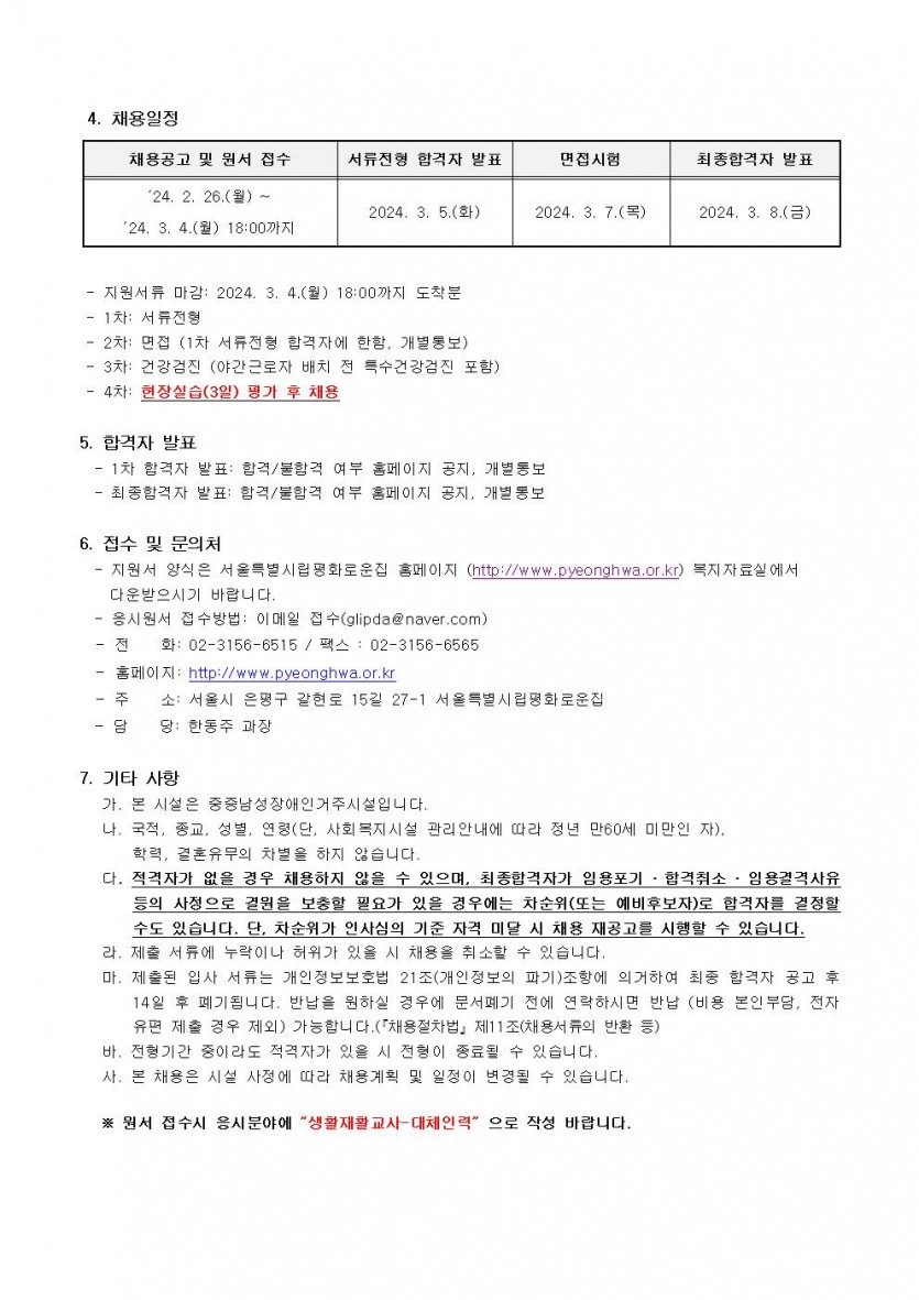 (긴급)서울특별시립평화로운집 생활재활교사 채용공고(연장) 페이지 정보 작성자 한동주 작성일 24-02-26 14:43 조회 20,166회 댓글 0건 첨부파일 파일 시립평화로운집 입사지원서이력서,자기소개서및개인정보동의서.hwp (22.5K) 143회 다운로드 DATE : 2024-02-26 14:43:58 본문 이전글 다음글 목록 답변