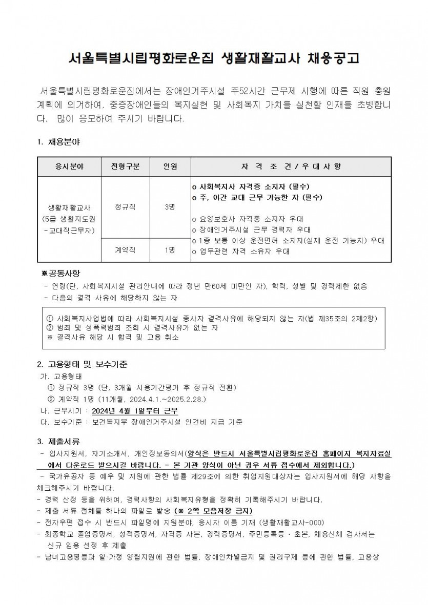 2024년 3차 직원채용(생활지도원) 모집공고 페이지 정보 작성자 한동주 작성일 24-03-07 17:21 조회 19,309회 댓글 0건 첨부파일 파일 시립평화로운집 입사지원서이력서,자기소개서및개인정보동의서.hwp (22.5K) 140회 다운로드 DATE : 2024-03-07 17:21:19 본문 장애인거주시설 주52시간 근무제 시행에 따라 정규직으로 근무할 생활재활교사(생활지도원) 채용 모집 공고를 실시하고자 합니다. 이전글 다음글 목록 답변