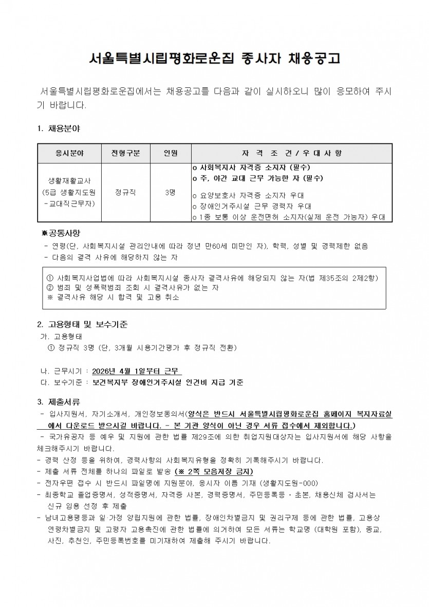 평화로운집 2026년 1차 직원채용공고 페이지 정보 작성자 한동주 작성일 26-03-05 16:17 조회 769회 댓글 0건 첨부파일 파일 2026년 1차 생활지도원.pdf (68.3K) 20회 다운로드 DATE : 2026-03-05 16:49:51 파일 시립평화로운집 입사지원서이력서,자기소개서및개인정보동의서.hwp (54.0K) 16회 다운로드 DATE : 2026-03-05 16:17:33 본문 이전글 다음글 목록 답변
