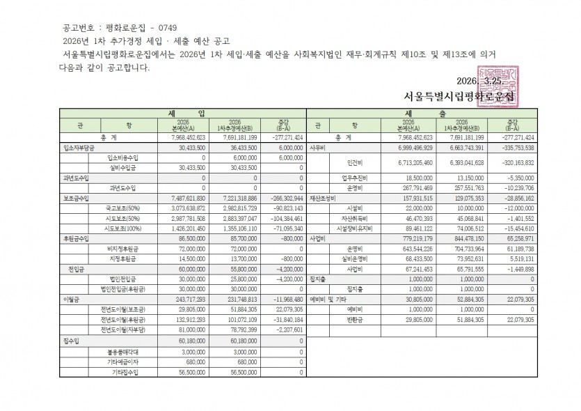 2026년 1차 추가경정 예산 공고 페이지 정보 작성자 한동주 작성일 26-03-25 16:51 조회 117회 댓글 0건 첨부파일 파일 홈페이지공고 .pdf (75.1K) 4회 다운로드 DATE : 2026-03-25 16:51:20 본문 이전글 다음글 목록 답변