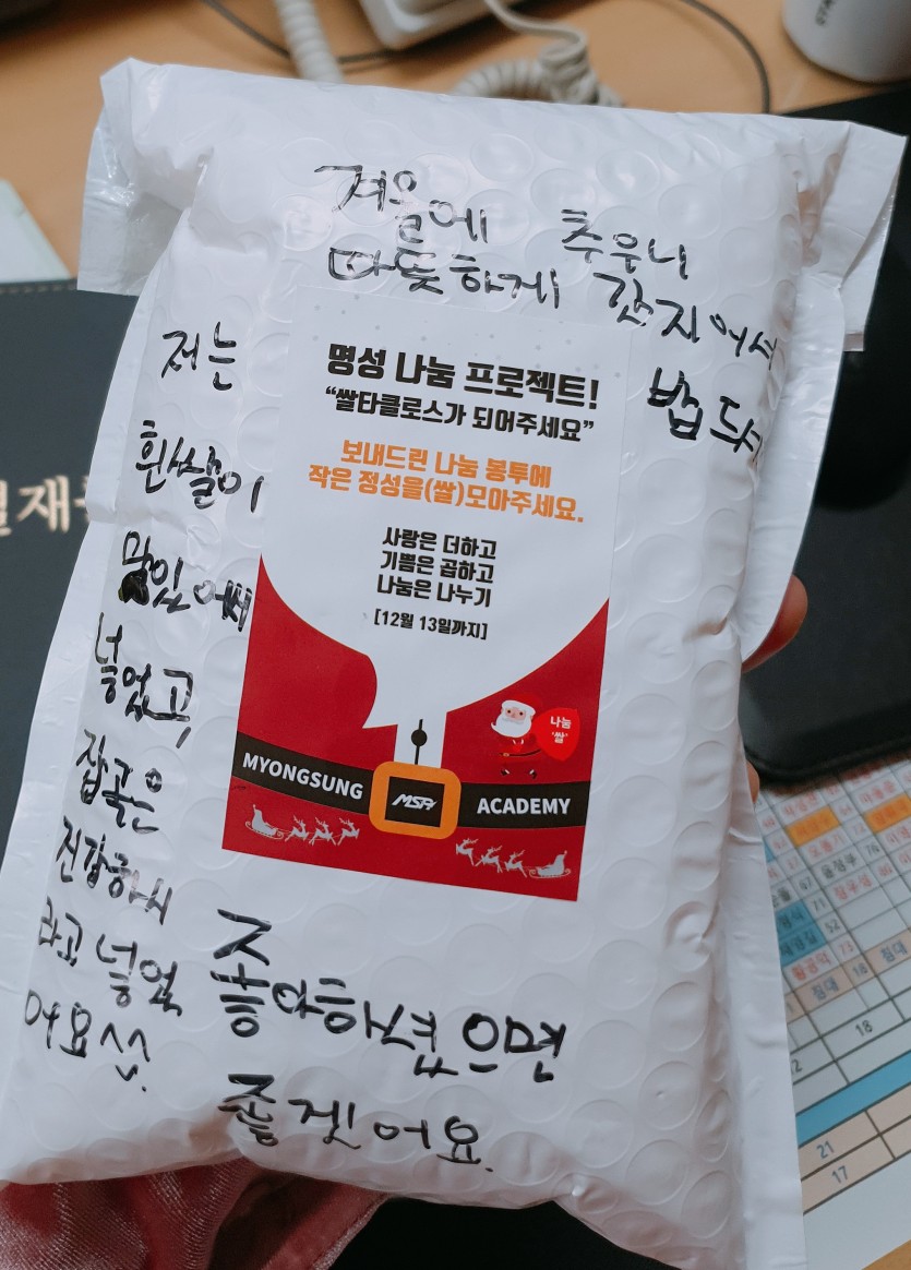 후원자·봉사자 이야기 | 명성체육관 후원물품 전달식 페이지 정보 작성자 박상은 작성일 19-12-30 17:27 조회 13,316회 댓글 0건 본문 매년 연말이면 우리 평화로운집에 따뜻한 나눔을 전하러 오시는 곳이 있습니다.바로 얼마 전 우수자원봉사단체상을 수상한 명성체육관 입니다!명성체육관에 다니는 아이들이 관장님의 마음을 따라나눔을 실천하고자 쌀을 모아주었습니다.아이들이 몇 달동안 함께 모아준 쌀 덕분에평화로운집 가족들은 올 겨울 내내 든든히 지낼 수 있을 것 같습니다^^천사같은 아이들의 손길로 모아진 값진 쌀!진심으로 고마움을 전합니다~♡ 이전글 다음글 목록