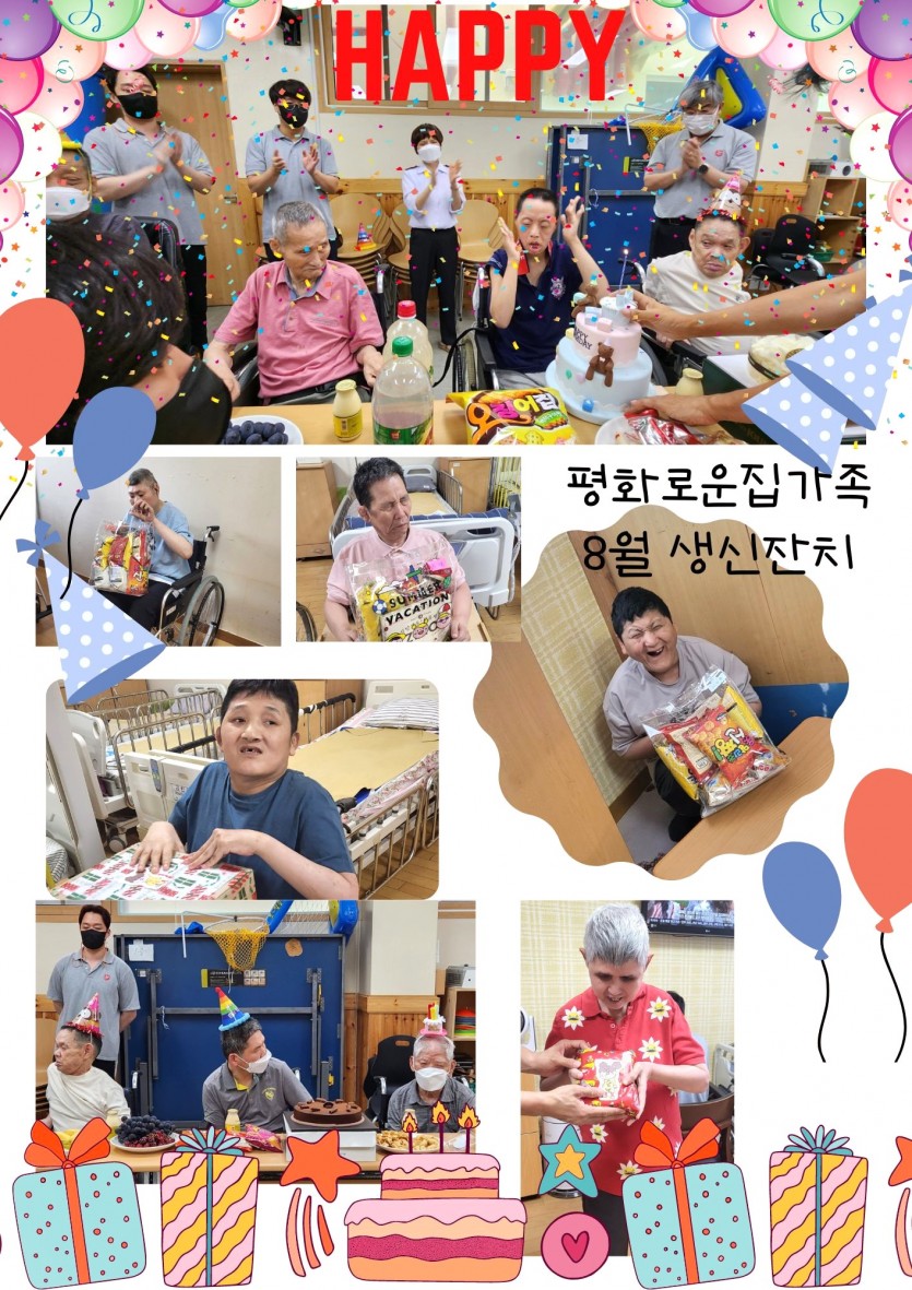 거주인 이야기 | 8월 생신잔치 페이지 정보 작성자 장설궁 작성일 23-08-08 15:39 조회 10,663회 댓글 0건 본문 평화로운집 가족의 8월 생일 잔치^^매년 돌아오는 날이지만항상 새로운 날이기도 하지요?연일 폭염이 지속되어 몸도 마음도 지치지만오늘만큼은 더 많이 웃고, 더 많이 행복하고, 더 많이 사랑받는 날되세요생일을 축하드리며 매일이 기쁨으로 가득 찬 행복한 날들이길 바랍니다. 이전글 다음글 목록