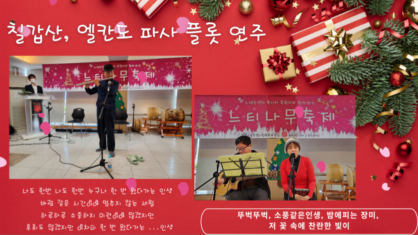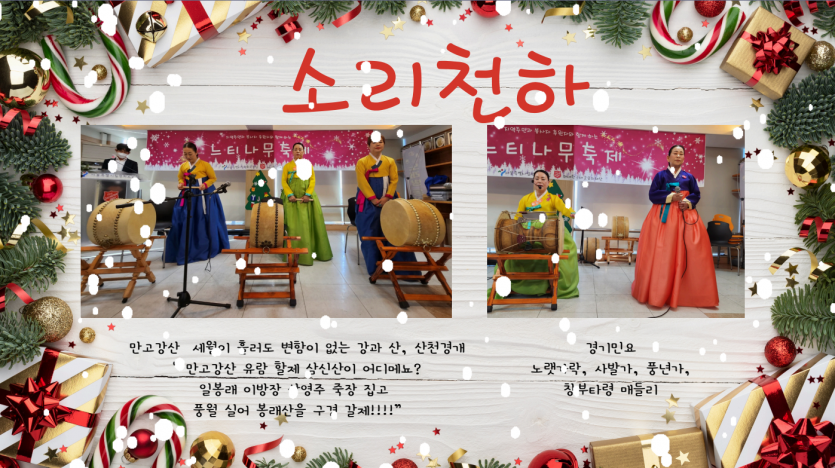 후원자·봉사자 이야기 | 1207 느티나무 축제 페이지 정보 작성자 장설궁 작성일 24-12-12 13:19 조회 6,582회 댓글 0건 본문 "2024년 12월 7일거주인, 자원봉사자, 후원자들과 함께 느티나무 축제를 진행하였습니다. 참석해주신 여러분들에게 감사의 마음을 전합니다. 여러분의 따뜻한 마음과 참여로 인해 행사는 더욱 특별하고 의미 있는 시간이 되었습니다. 여러분의 지지와 도움에 진심으로 감사드립니다. 다시 한 번 참석해주신 여러분들에게 진심으로 감사의 말씀을 전하며, 앞으로도 함께 더 많은 아름다운 순간을 만들어 나가기를 기대합니다. 감사합니다." 이전글 다음글 검색 목록