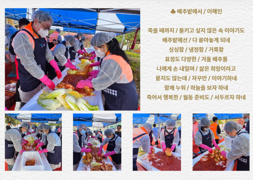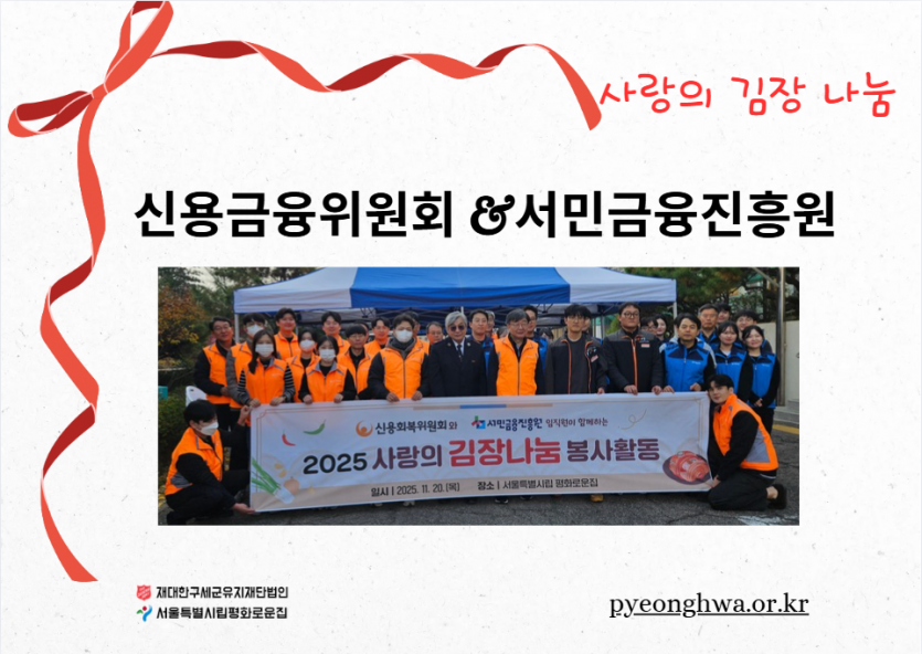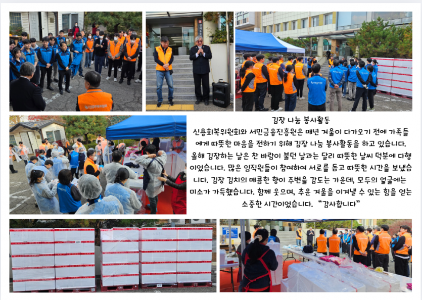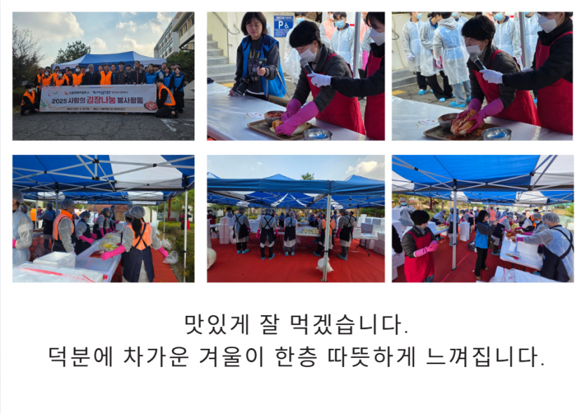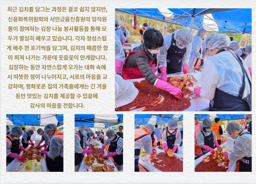 후원자·봉사자 이야기 | 신용회복위원회와 서민금융진흥원과 함께 하는 김장 페이지 정보 작성자 장설궁 작성일 25-11-26 11:16 조회 1,705회 댓글 0건 본문 신용회복위원회와 서민금융진흥원과 함께한 김장임직원분들께서 직접 김치를 담으며 가족분들이 겨울에 맛있게 드신다는 생각에 한 포기 한 포기 정성을 담아따뜻한 마음을 전해주셨습니다. 이 김치가 식탁에 오를 때마다 사랑이 깃든 이 따스함을잊지 않겠습니다. 함께해 주신 모든 분들께 다시 한 번 깊은 감사를 드립니다.고맙습니다.감사합니다. 이전글 다음글 목록