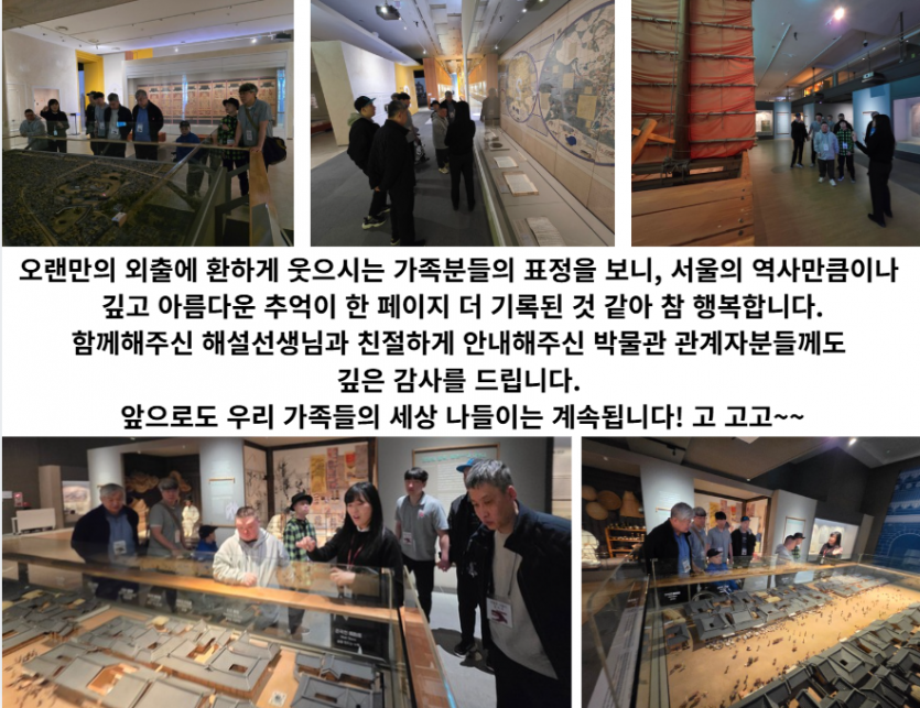 거주인 이야기 | 서울역사박물관 견학 페이지 정보 작성자 장설궁 작성일 26-04-03 17:37 조회 60회 댓글 0건 본문 살랑살랑 불어오는 봄바람을 타고, 우리 평화로운집 가족들은 서울의 역사가 살아 숨 쉬는 '서울역사박물관'으로 나들이를 다녀왔습니다.박물관 곳곳을 둘러보며 옛 서울의 풍경에 발길을 멈추기도 하고, "예전엔 이랬지~" 하며 정겨운 옛 기억을 소환해보기도 하는 뜻깊은 시간이었습니다. 세심하게 준비된 전시물들 덕분에 가족분들도 모두 편안하고 즐겁게 관람을 마칠 수 있었습니다. 다음글 목록