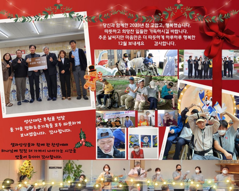 2023년 12월 후원 감사편지 페이지 정보 작성자 장설궁 작성일 23-12-11 10:58 조회 7,351회 댓글 0건 본문 12월 평화로운집 가족들 이야기어느덧 한 해를 마무리하는 12월이 되었습니다. 마음 따뜻하고 미소 지을 일이 많은 한 달이 되셨으면 합니다. 연말이라 바쁘신 일들이 많겠지만 남은 한 달 후회 없도록 마무리 잘하시고 뜻하신 일 모두 이루시길 바랍니다. 평화로운집 가족만의 행복이 아닌 모든 이들이 행복한 연말연시를 보내시길 기도하겠습니다. 좋은 사람들과 함께한다는 것은 참 행복한 일인 것 같습니다. 올 한 해 동안 후원자님들과 함께해서 행복하고 감사했습니다. 이전글 다음글 목록