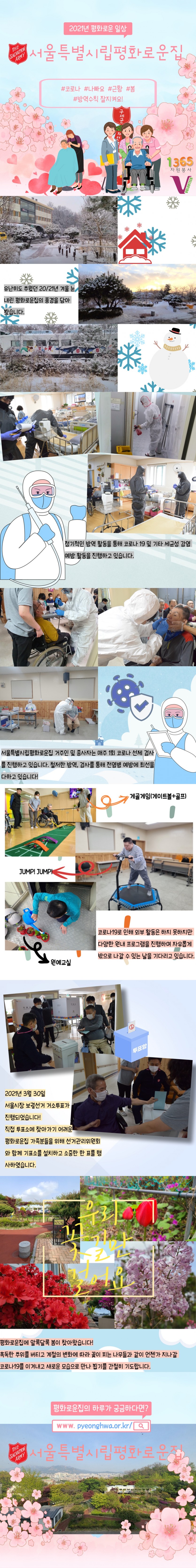 서울특별시립평화로운집 4월 카드 뉴스! 페이지 정보 작성자 박성호 작성일 21-04-23 17:26 조회 17,042회 댓글 0건 본문 코로나19로 인해 오랜 기간 시립평화로운집을 방문하지 못한 봉사자님을 위해 최근 근황을 카드뉴스를 통해 전해 드리고자 합니다.앞으로 지속적으로 업로드될 예정이니 많은 관심 부탁드립니다~~ ^3^ 이전글 다음글 목록